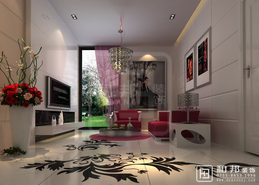 紅色系的沙發、電視柜旁邊搭配一株紅粉搭配的植物,給人一種協調的美感,傳遞著舒適的氣息,明亮的光線從寬大的窗戶照進,讓客廳空間顯得寬敞大氣。